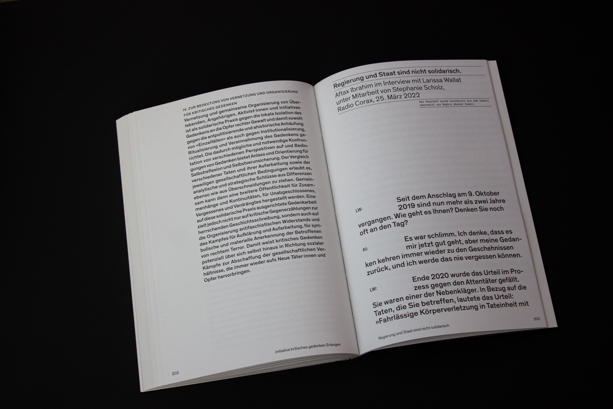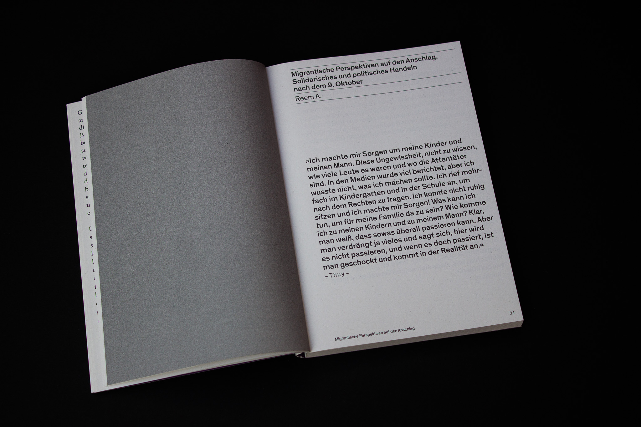 In dem Sammelband »Der Halle-Prozess: Hintergründe und Perspektiven« schreiben 14 Autor*innen – Überlebende, Anwält*innen, Aktivist*innen, Künstler*innen und Forscher*innen – über Aspekte der Tat, der Ideologie, der Betroffenheit und der Gegenwehr. Auf die Mitschriften der Prozesstage folgt damit ein Jahr später eine Text- und Bildsammlung, die die Tat und den Gerichtsprozess aus verschiedenen Positionen beleuchtet.