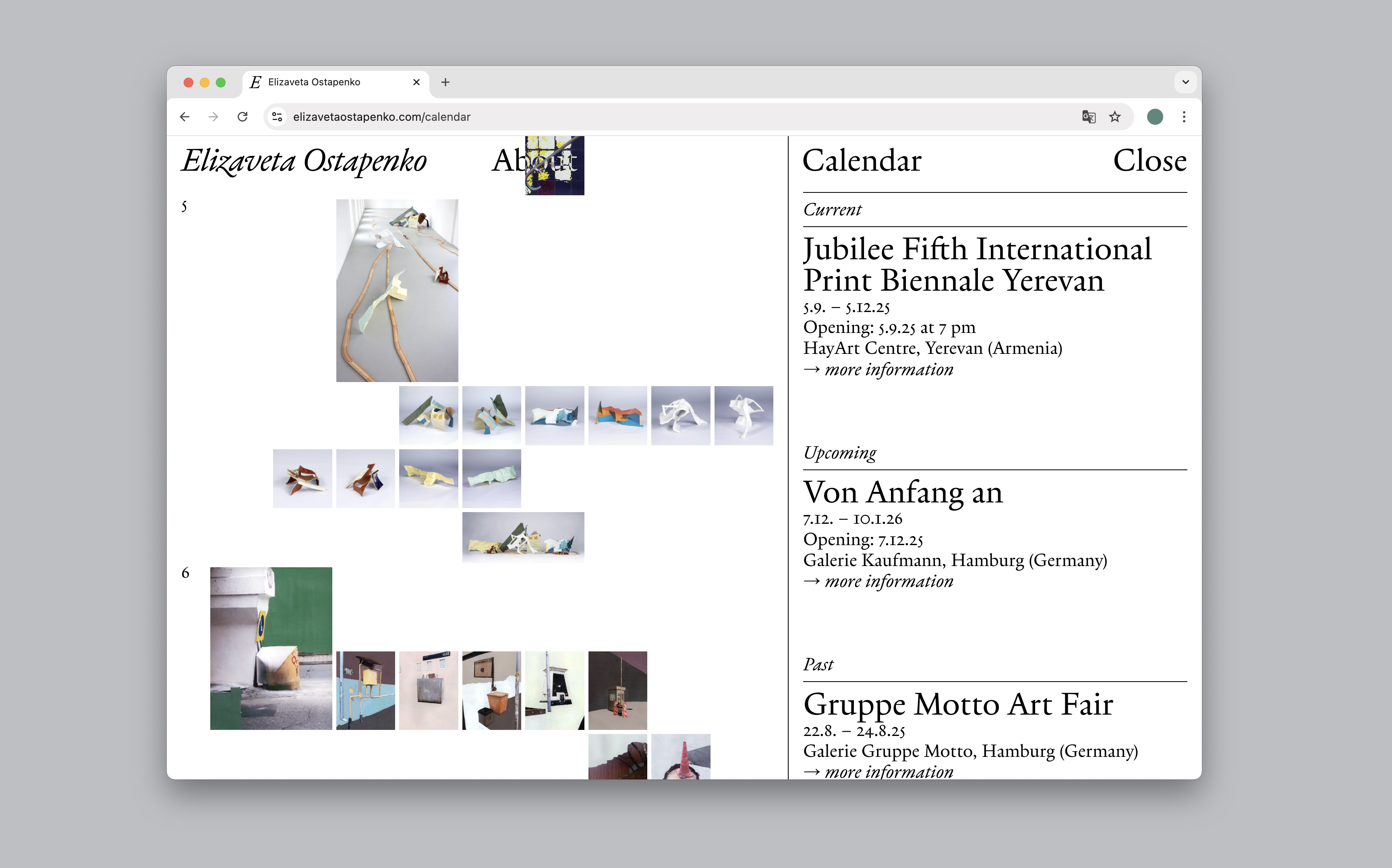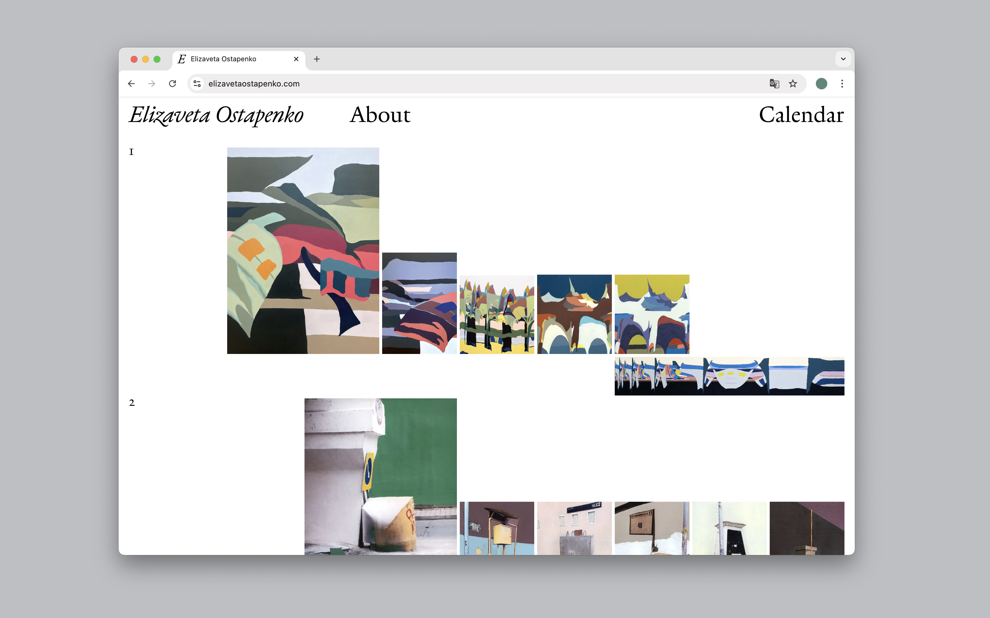 Die Website für Elizaveta Ostapenko begleitet die Praxis der Künstlerin, deren Arbeiten aus der Beobachtung alltäglicher Umgebungen entsteht. Sie untersucht Prozesse von Transformation sowie Zustände von Bewegung und Statik, sammelt gefundene architektonische Fragmente und de- und rekonstruiert sie zu neu komponierten Räumen.